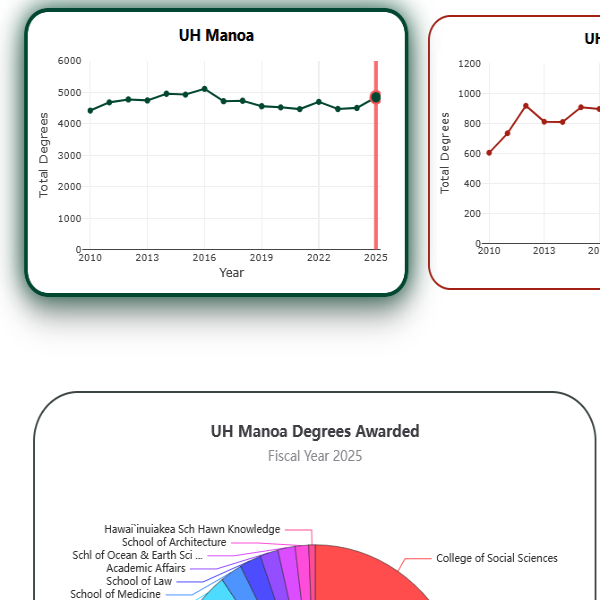 A data visualization of the degrees awarded by three UH campuses from 2010-2025.