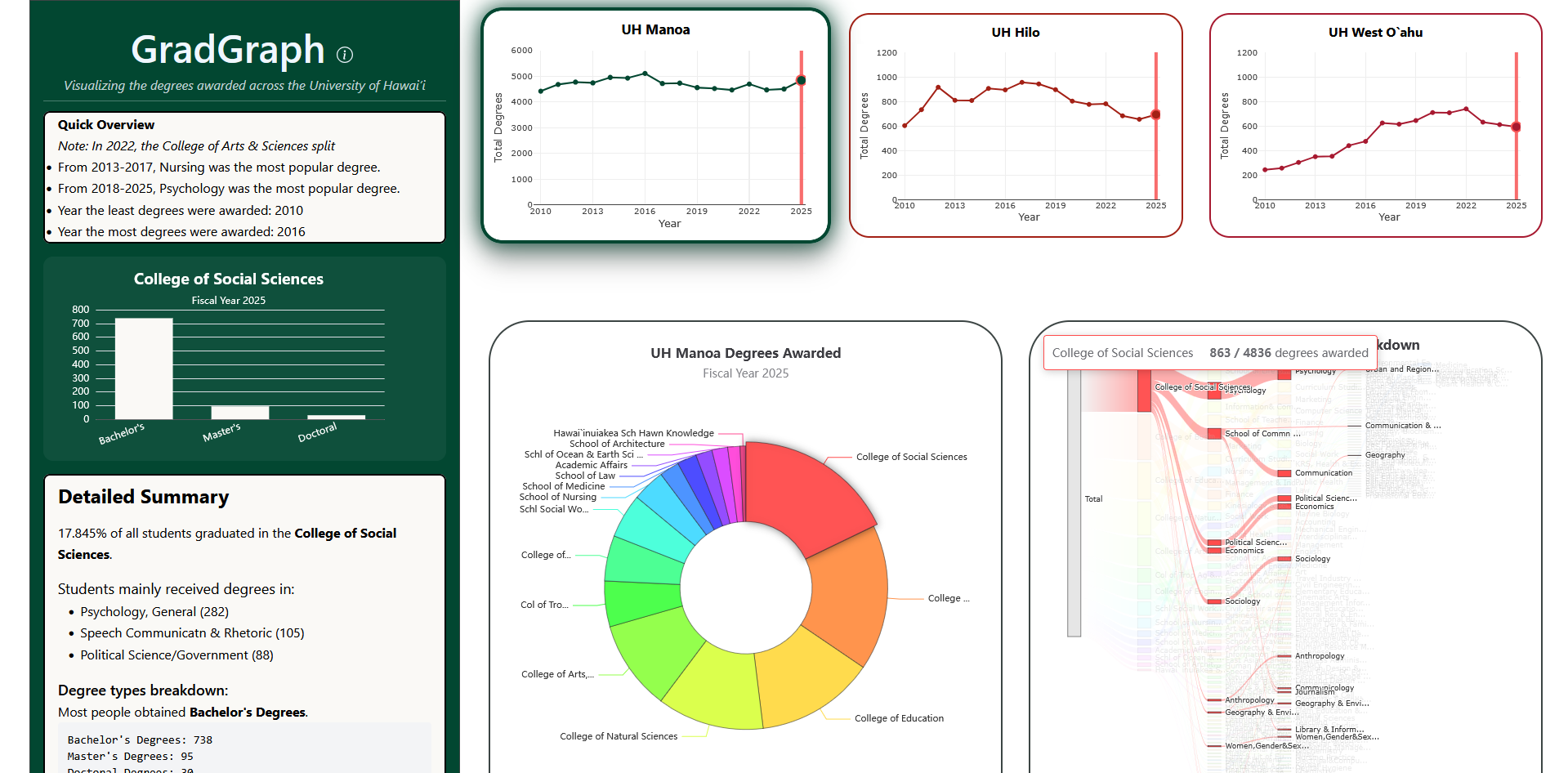 GradGraph is a website that visualizes the number of degrees awarded by fiscal year, campus, degree type, and academic group via various charts using Apache ECharts and Plotly.js. The data that was used is a CSV file that is available on Hawaii Open Data, which was filtered to focus on three UH campuses: UH Manoa, UH West O`ahu and UH Hilo. This website was created in collaboration with Adam Graham and Jaren Pinera as a project assignment for ICS 484. I was responsible for the sankey diagram, the website layout, and some of the CSS styling.